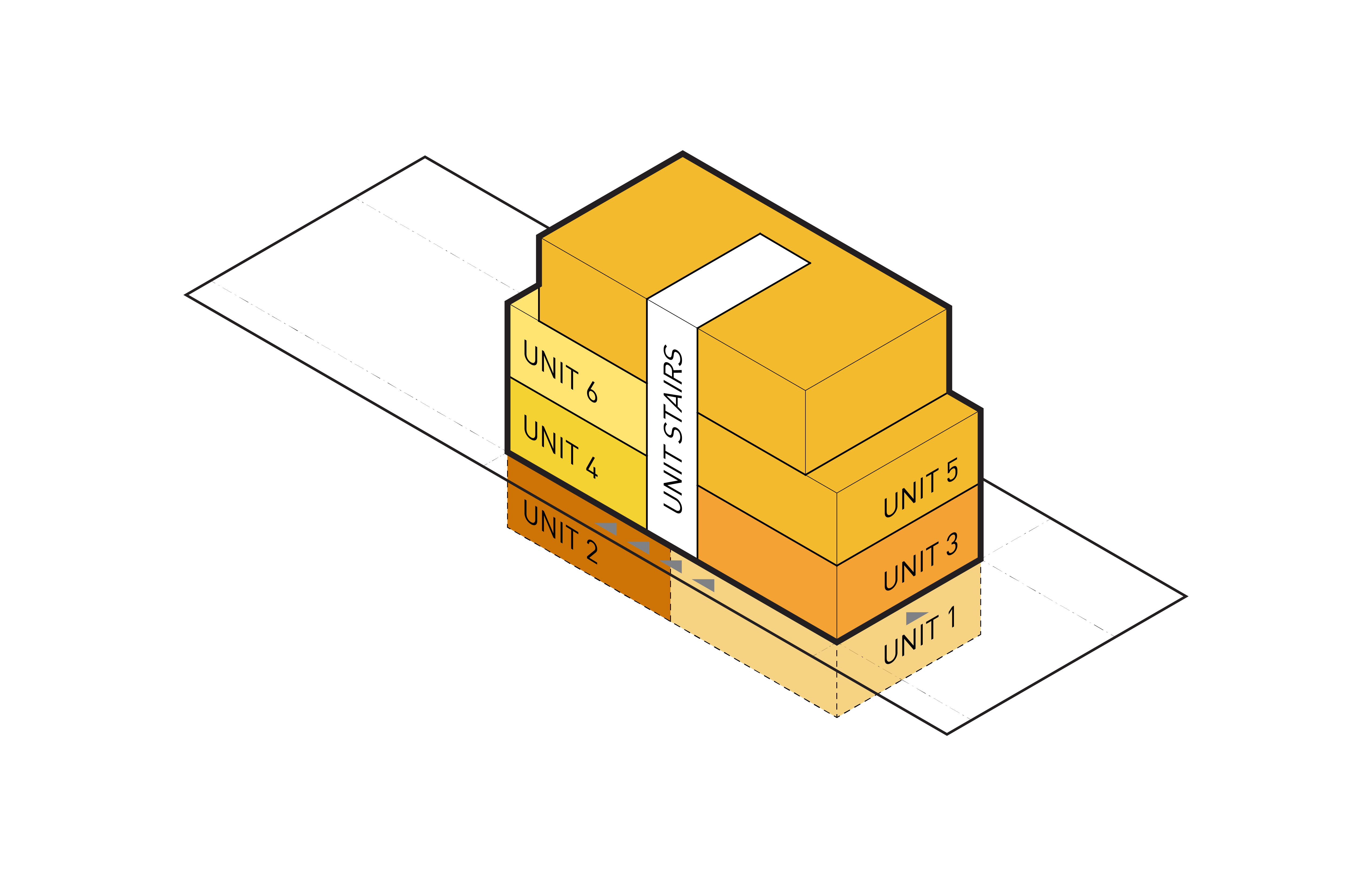 In this style of New Multiplex, each unit has its own separate entrance and stair from the ground floor. The basement, ground floor, and second floor each have a unit towards the front and a unit towards the back, with the unit at the front of the second floor continuing into the third floor. The basement units are accessed via their sunken courtyards, which also function as light wells and private outdoor space.