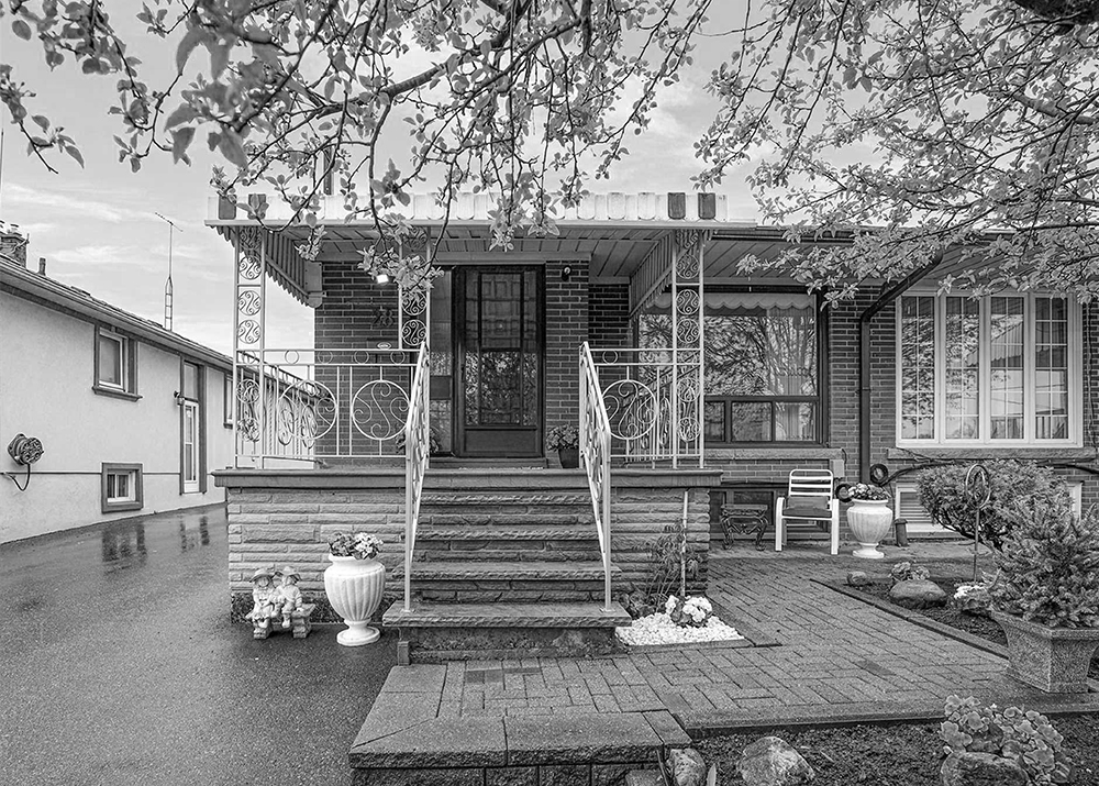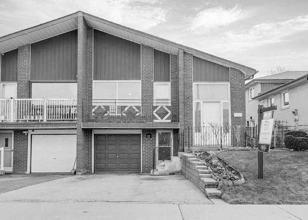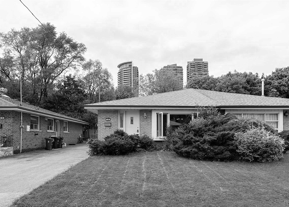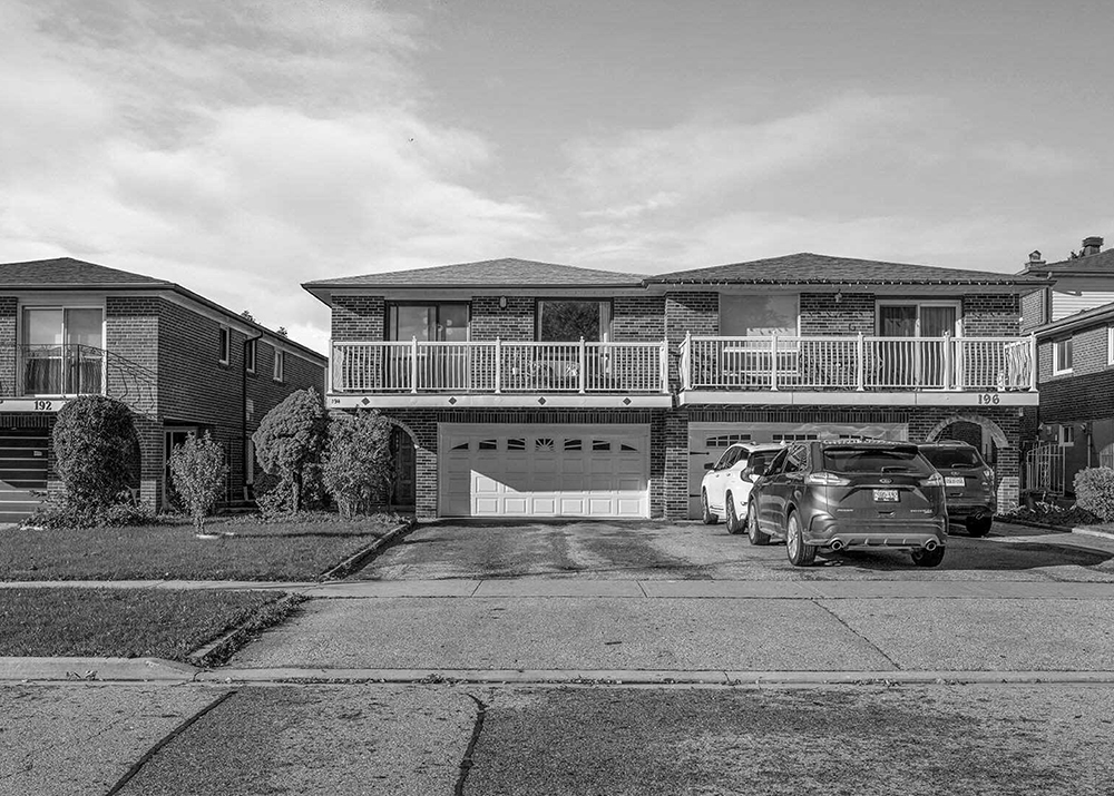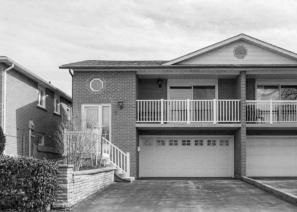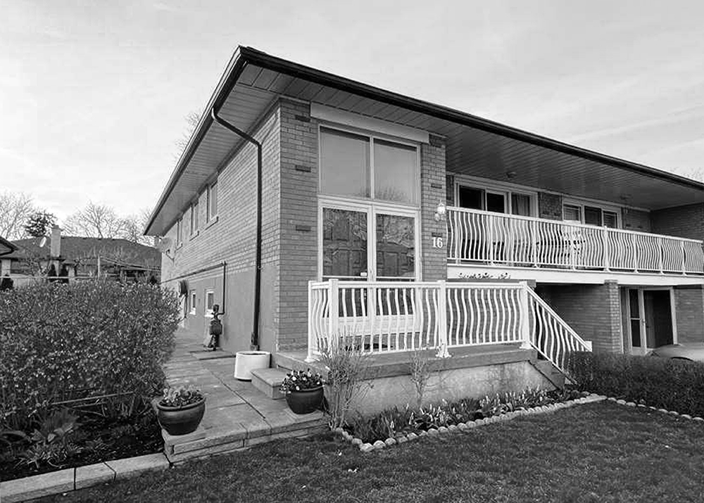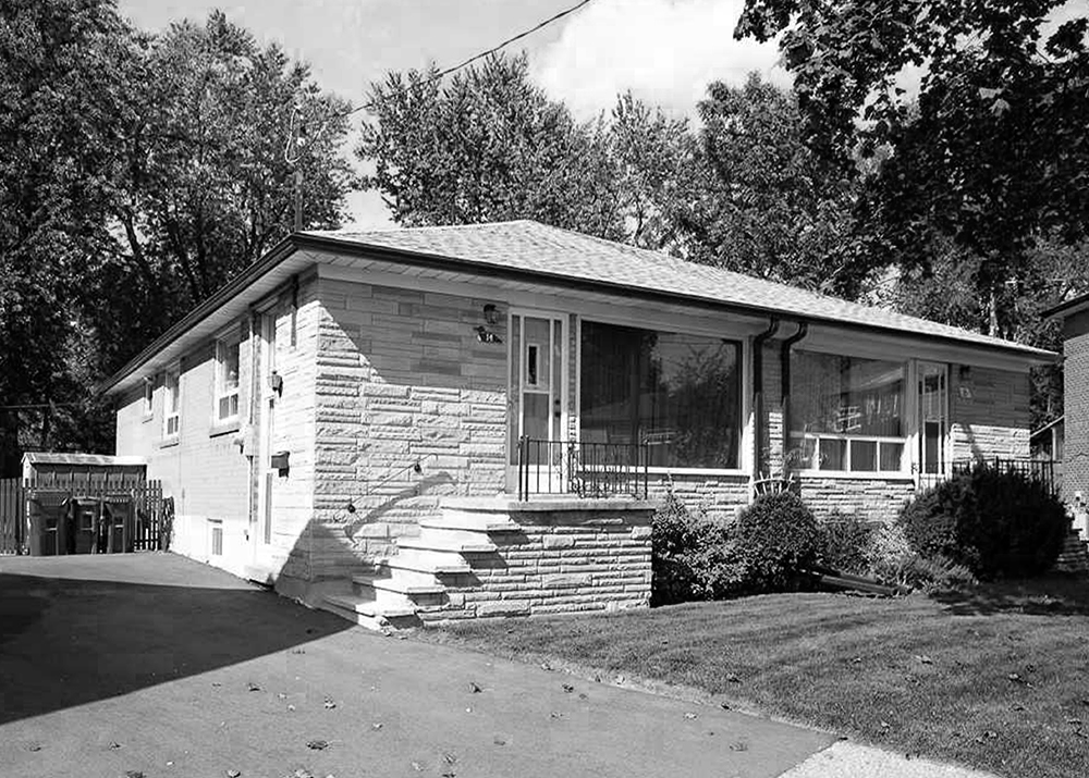 The Postwar Semi 1-Floor is a raised, semi-detached bungalow with a shallow or full basement. Commonly found in the neighbourhoods of North York and Scarborough, there are several variants to this type, with the most common designs having a basement garage and a sloped driveway cutting into the site. Similar to the Postwar Bungalow type, the floor plan is typically arranged with kitchen, living and dining rooms toward the front and three bedrooms toward the back.
