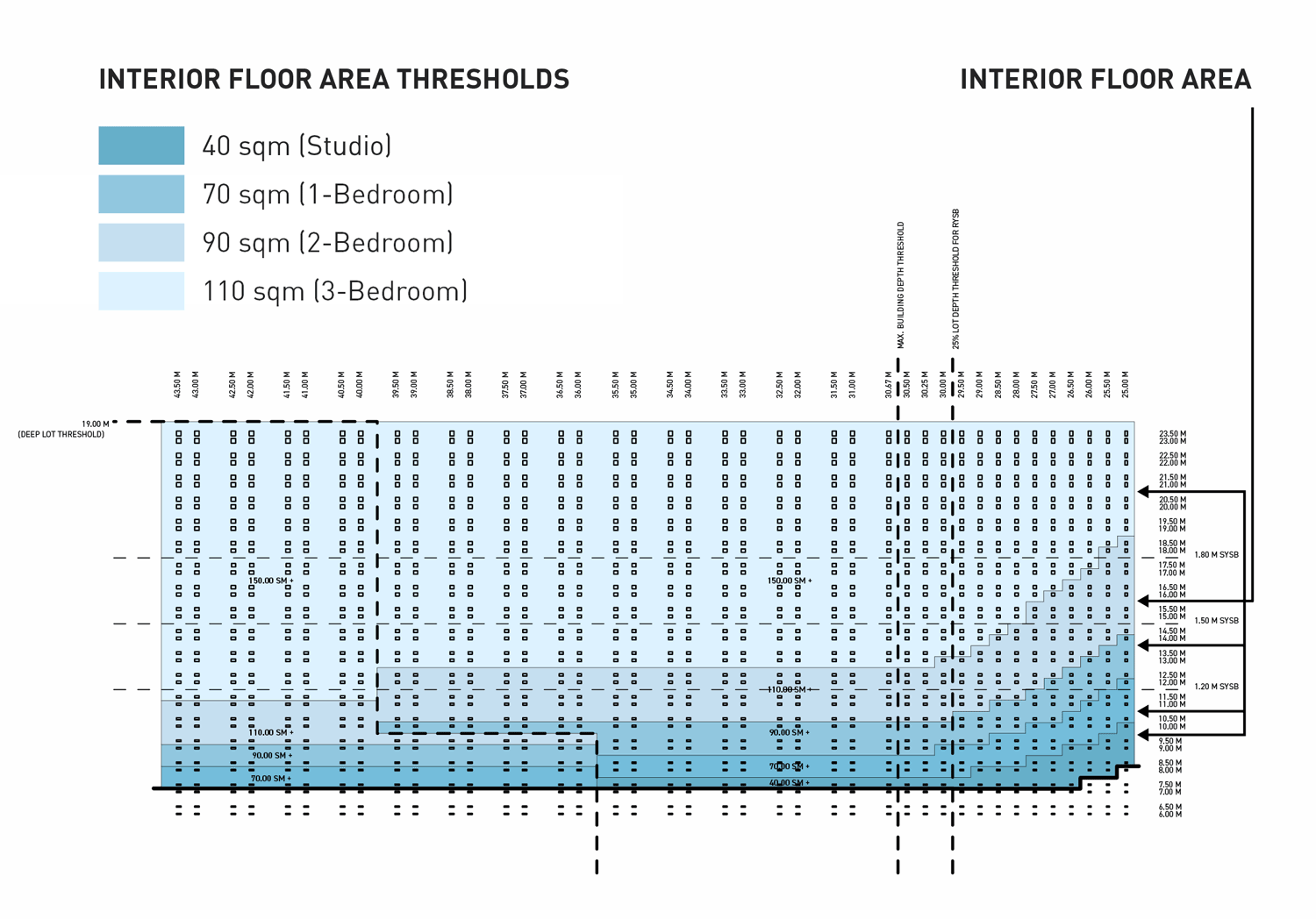 Using a matrix of 1,440 different parcel sizes at half-meter increments of width and depth, we mapped diagrammatic floorplates that fit on each parcel. This established a foundational understanding of which parcels can support fourplex development.Zoning restrictions - Front yard Setbacks (FYSB), Side yard Setbacks (SYSB), Rear yard Setbacks (RYSB), and Maximum Building Depths - determined the buildable footprint for each lot size. This buildable footprint defined the building envelope of the overall exterior massing a fourplex is allowed to take up.