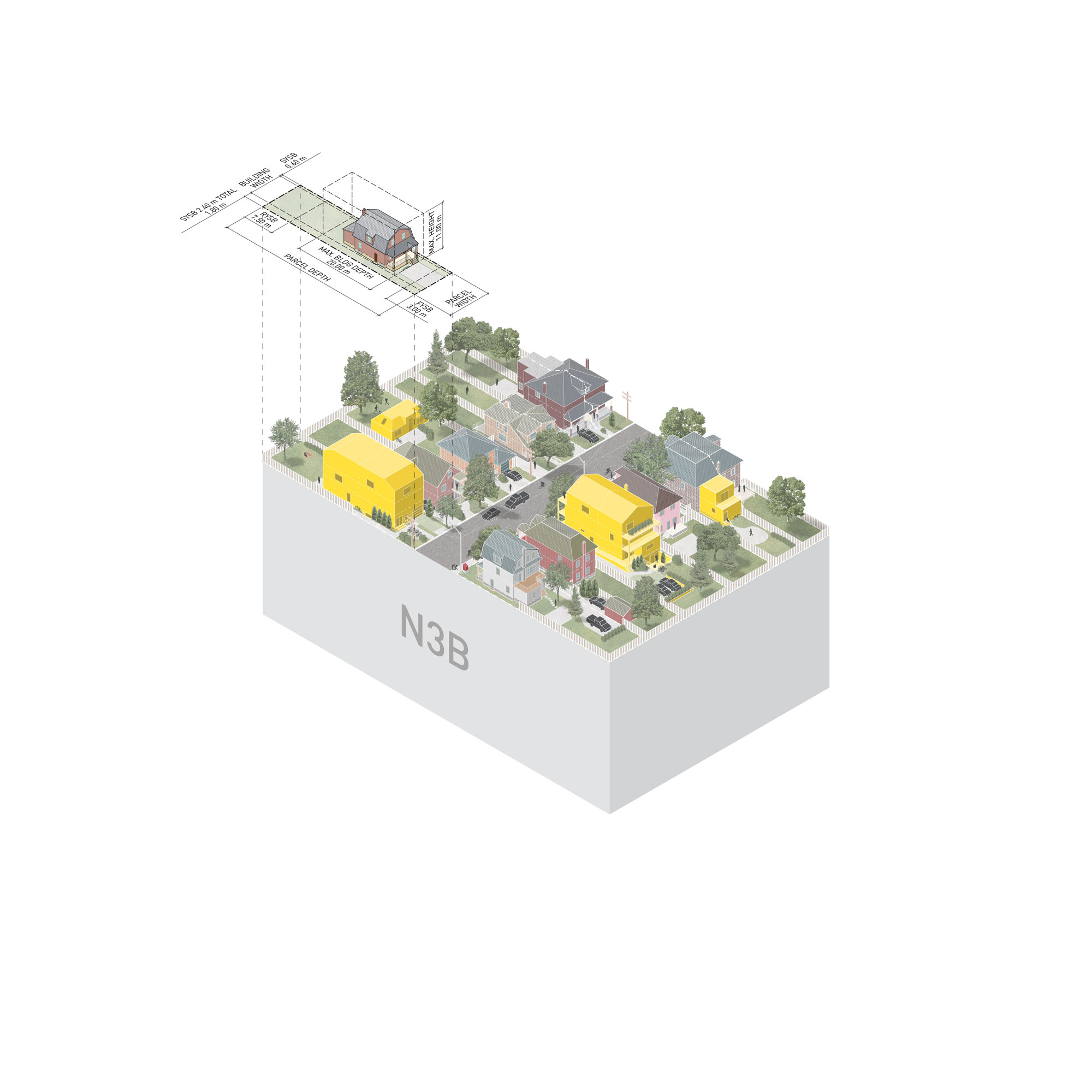 Together, these regulations combine to allow different levels of gentle density. Our block-scale axonometrics tested the building envelopes produced by the Neighbourhood Zones and Subzones rules on N1, N2, N3 and N4 Zones.