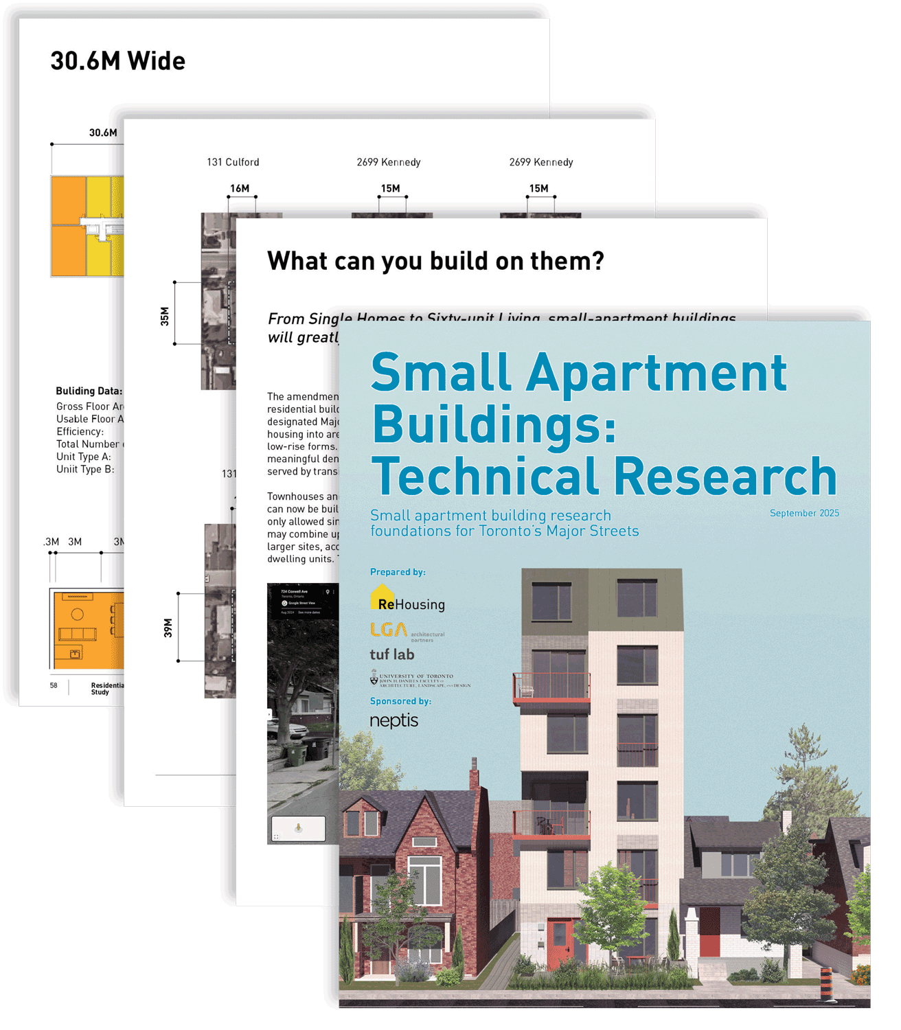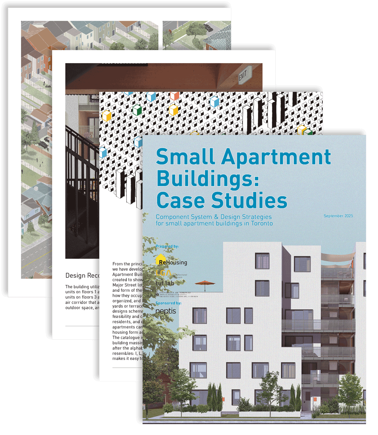 ReHousing’s study of small apartment building feasibility for major streets in Toronto is summarized in the Technical Research and Design Proposals reports.
