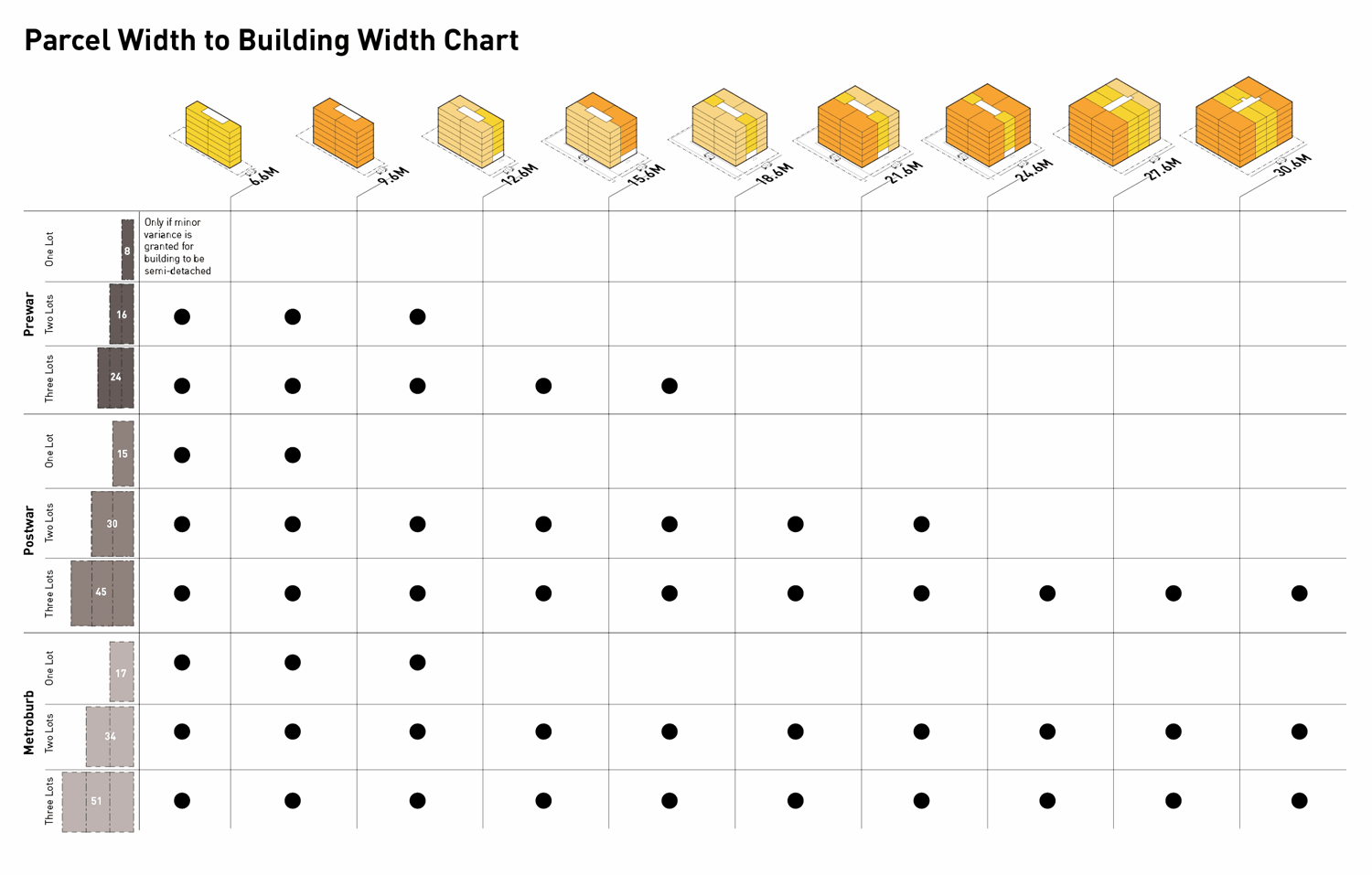 This chapter introduces a design framework that demonstrates what can be built on typical Major Street parcels across Toronto. This framework is organized by lot size and by building shape, with each design responding to the dimensional constraints and opportunities of one, two, or three assembled parcels.