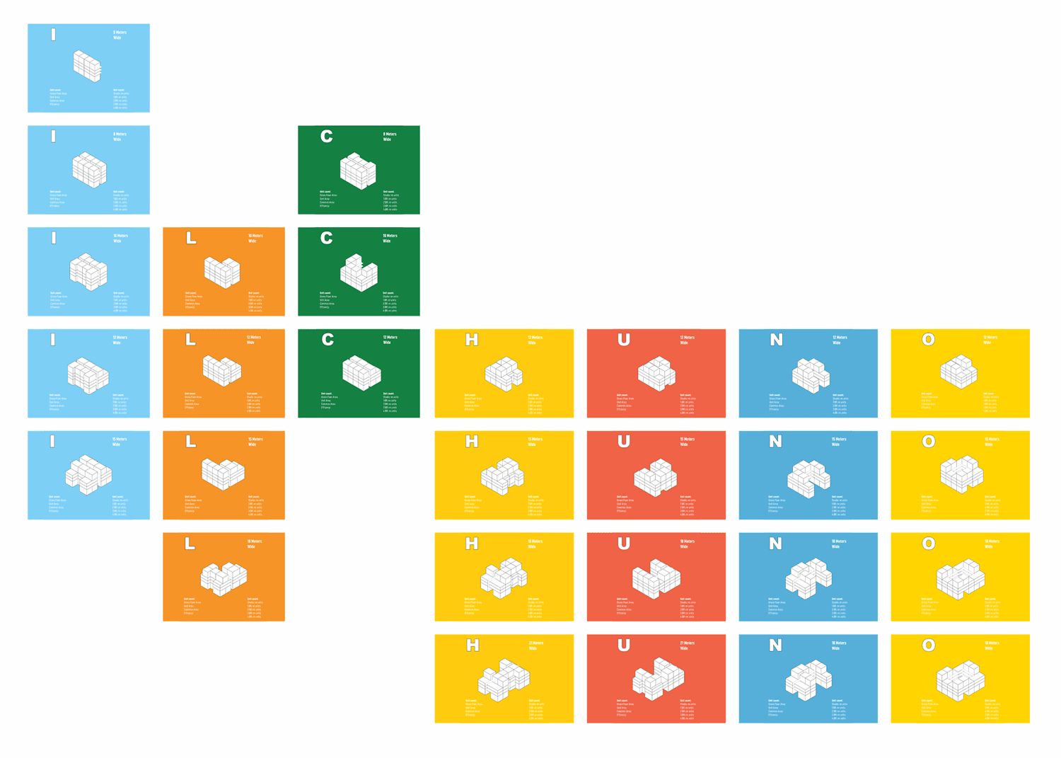 The building massings are generated using a component-based system, where standardized unit “blocks” serve as the building’s primary elements, which are combined into repeatable clusters. The resulting building shapes roughly correspond to the shapes of letters of the alphabet, together forming the acronym ILCHUnO, which we have used to organize this catalogue.