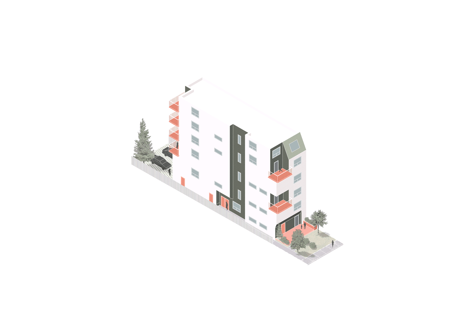 We chose to take a closer look at three representative examples from the component-based system catalogue. These case studies allowed us to test how well the catalogue can translate into real buildings by working through interior layouts, circulation, and common areas. They also allowed us to produce more detailed visualizations, including renders, axonometrics, and diagrams that illustrate how these buildings could fit within their neighbourhood contexts.
