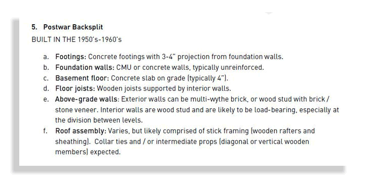 The final section of the report goes through each of the 13 most typical housing types in Toronto (found in our design catalogue) and breaks down the typical structural considerations for each.