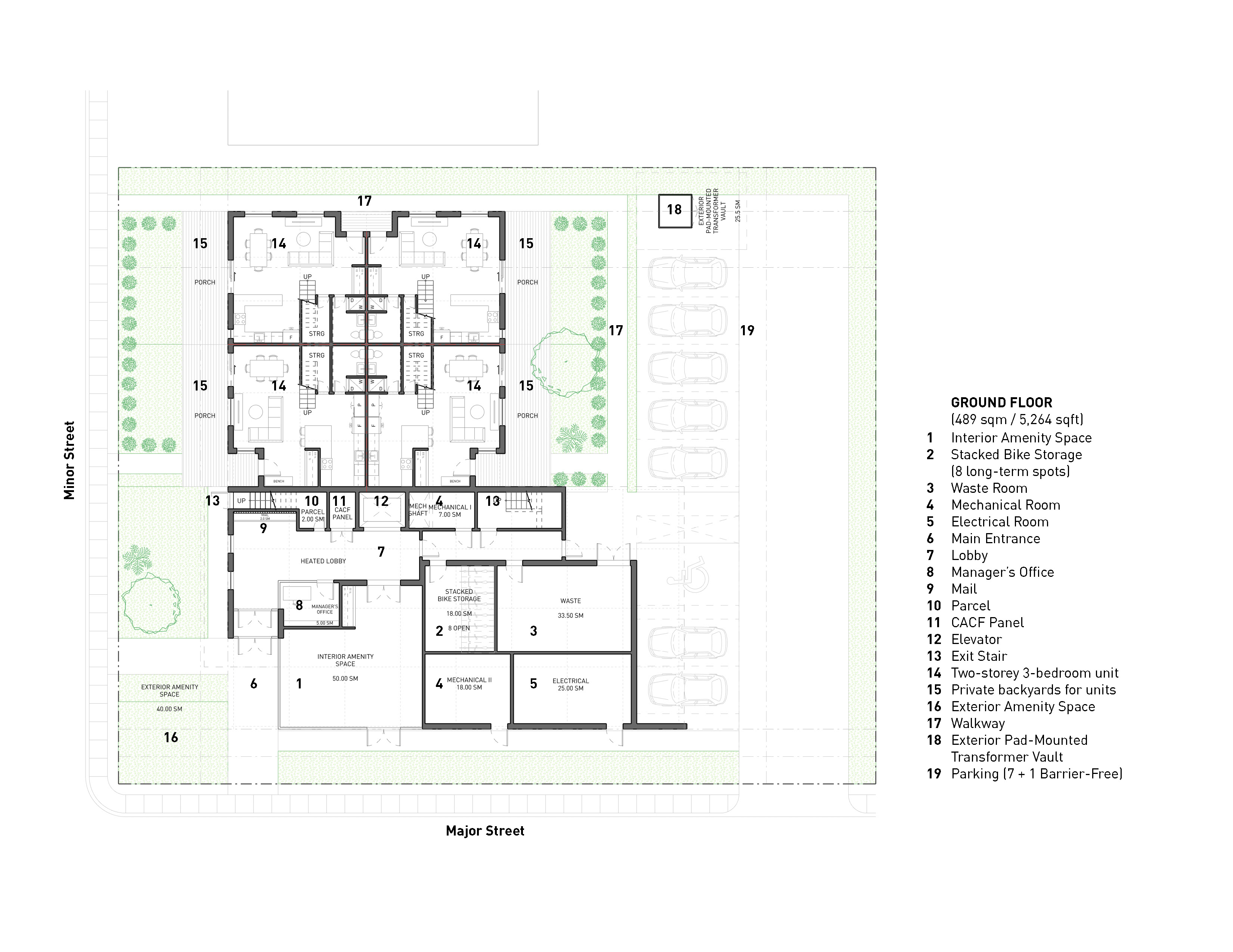 This building makes use of external circulation. Units on floors 1 and 2 are accessed from grade, while units on floors 3, 4, and 5 are accessed from an open-air corridor that also serves as a communal outdoor space. Units on floors 5 and 6 are two-storey units and each have a rooftop garden, providing residents with additional outdoor areas. Communal services are located on the ground floor facing the Major Street. This combination of unit types and outdoor spaces seeks to blend the best aspects of apartment living—shared utilities and a sense of community—with the benefits of single-family living, including outdoor access and privacy.